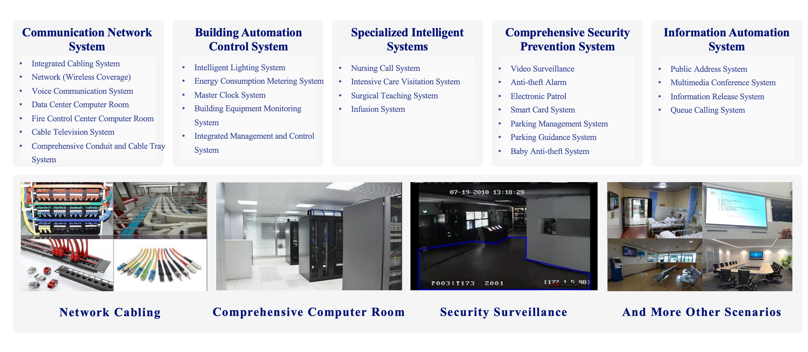 The comprehensive smart system for the entire hospital includes the Communication Network System, Comprehensive Security Prevention System, Building Automation Control System, Information Automation System, and specialized smart systems for medical services. These systems are unified and integrated, working together synergistically, combined with the hospital's core foundational business systems to build a complete, efficient, and intelligent smart hospital.